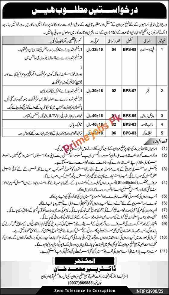 Agriculture Department Extension jobs in Mardan 2025 have been recently announced through the advertisement of newspaper daily express. Applications on plain paper are invited from enthusiastic, dynamic, and job-oriented individuals holding domicile of District Mardan for recruitment against the following vacant positions.These vacant positions are currently open for Field Assistant, Fitter, Vehicle Driver, Naib Qasid, and Field Worker, for which the department requires the services of talented and professional staff.Interested individuals who meet the eligibility criteria specified by the department are eligible to apply.