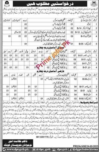 The recruitment for the above-mentioned vacant positions will be carried out in accordance with the prevailing Recruitment Policy 1991 of the Government of Balochistan.Interested individuals who meet the criteria set by the department for the advertised posts, such as educational qualifications and upper age limit, are eligible to submit their applications.These positions include Caretaker, Computer Instructor, Assistant Computer Operator, Junior Clerk , Security Guard , Naib Qasid , Chowkidar , Farash , Sweeper and Driver, for which the department requires the services of hardworking and professional staff. Among these available positions, a quota of 05% has been reserved for persons with disabilities, 05% for minorities, and 05% for women, in accordance with government regulations.
