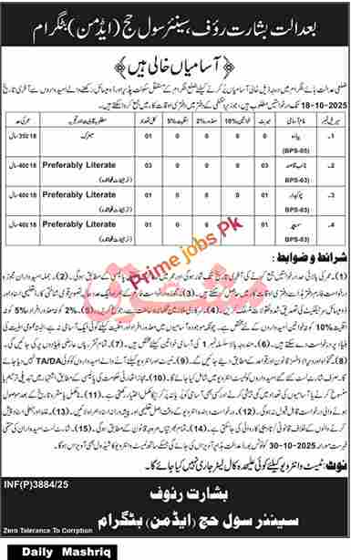 District Courts Battagram Jobs 2025 have been recently published advertisement through the newspaper daily Mashriq. Applications are invited on the prescribed form from candidates who are permanent residents of District Battagram and possess a domicile of the district, to fill the following vacant posts in the District Courts Battagram.All appointments will be made on a temporary basis. Interested individuals who meet the criteria for the posts are eligible to apply.