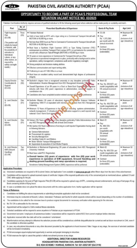 Golden Opportunity to Become a Part of PCAA Professional Team Situation Vacant Notice No. 03/2025 Recently published through Daily Mashriq Newspaper.Pakistan Civil Aviation Authority (PCAA) invites applications from qualified and competent candidates to fill the following vacant positions.Candidates who qualify as per the criteria are advised to apply online.