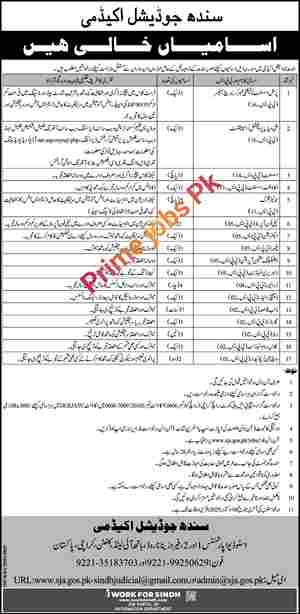 Sindh Judicial Academy in Karachi is currently seeking the services of hardworking and dedicated staff for positions such as Personal Assistant to Faculty Member/Research Officer, Multimedia Professional/Specialist, Assistant, Accountant Assistant, Junior Clerk, Telephone Operator, Electrician, Plumber, Duplicating Machine Operator, Library Attendant, Driver, Dispatch Rider, Naib Qasid, Gardeners, Waiter, Classroom Attendant, and Watchman/Chowkidar.
